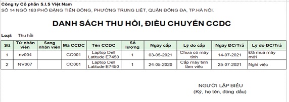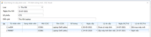 Có thể thu hồi từ nhiều nhân viên trên một phiếu để tiện cho việc in phiếu xem đầy đủ thông tin thu hồi CCDC. Nếu ngày thu hồi khác nhau chỉ việc chọn trong trường “Ngày ĐC/Trả”