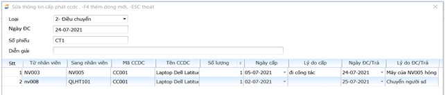 Có thể điều chuyển từ nhiều nhân viên sang nhân viên trên một phiếu để tiện cho việc in phiếu xem đầy đủ thông tin điều chuyển CCDC. Nếu ngày điều chuyển khác nhau chỉ việc chọn trong trường “Ngày ĐC/Trả”