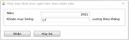 Mỗi nhân viên theo quy định sau khi ký hợp đồng lao động chính thức sẽ có 12 ngày nghỉ phép trong năm. Số ngày nghỉ phép đó được nhập ở khai báo định mức nghỉ năm cho từng nhân viên và nhập theo nhóm nhân viên trong khoản mục lương.