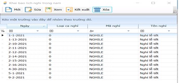 - Loại ca nghỉ: Chọn loại ca nghỉ: 0- Nghỉ cả ngày; 1- nghỉ sáng; 2- nghỉ chiều; 3- nghỉ tối