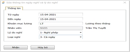 Chức năng này cho phép cập nhật thông tin nhân viên nghỉ, vắng mặt do các phát sinh nghỉ phép, nghỉ ốm, nghỉ không lương.