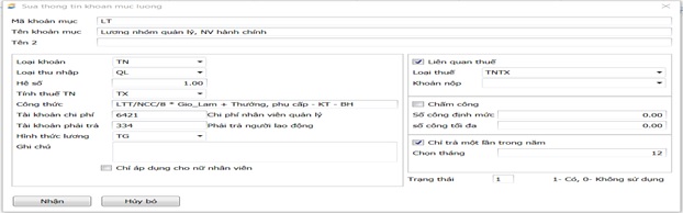 • Mã khoản mục và Tên khoản mục: Là 2 thông tin quan trọng để phân nhóm phục vụ cho việc chấm công, tính lương.