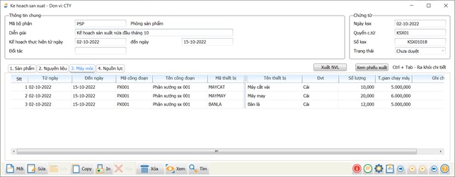 Tab Máy móc: Lên kế hoạch sử dụng máy móc cho kế hoạch sản xuất trong kỳ