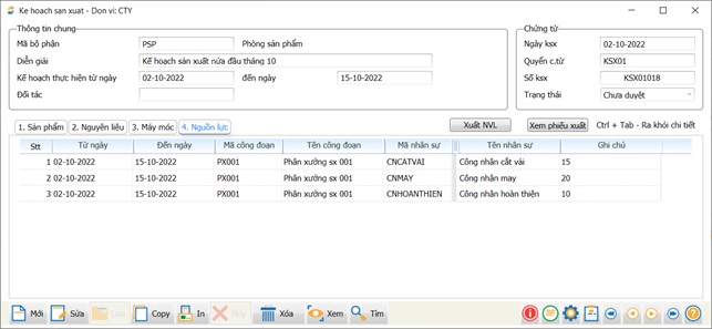 Tab Nguồn lực: Lên kế hoạch nhân công thực hiện theo kế hoạch sản xuất trong kỳ