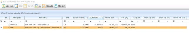 Mức tối thiểu (MIN) là số lượng tồn kho tối thiểu được nhập trong danh mục vật tư. Báo cáo này sẽ liệt kê các vật tư có tồn kho nhỏ hơn mức tối thiểu đó.
