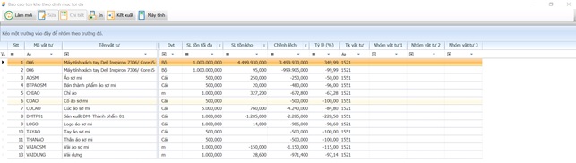 Định mức tối đa (MAX) được nhập trong danh mục vật tư, hàng hóa. Báo cáo này nhằm mục đích so sánh tồn tức thời với mức tối đa cho phép tồn trong kho, từ đó đưa ra những phương án sản xuất phù hợp.