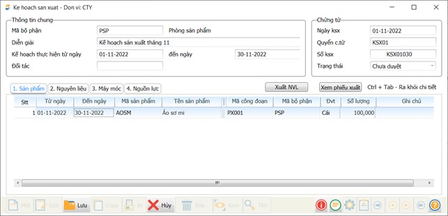 - Đường dẫn: Quản trị sản xuất/Quy trình sản xuất/Kế hoạch sản xuất/Nhập xuất tồn
