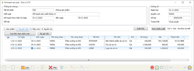 - Click nút <<Tạo NVL theo định mức>> chương trình sẽ gắn thông tin nguyên vật liệu thuộc kỳ lập kế hoạch sản xuất.