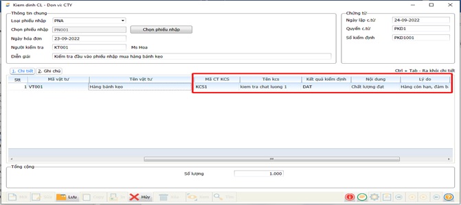 Tích chọn phiếu sau đó bấm “Nhận” chương trình sẽ lấy lên các thông tin của phiếu nhập xuất, Người dùng chỉ cần điền thêm các thông tin về kết quả kiểm định như hình: