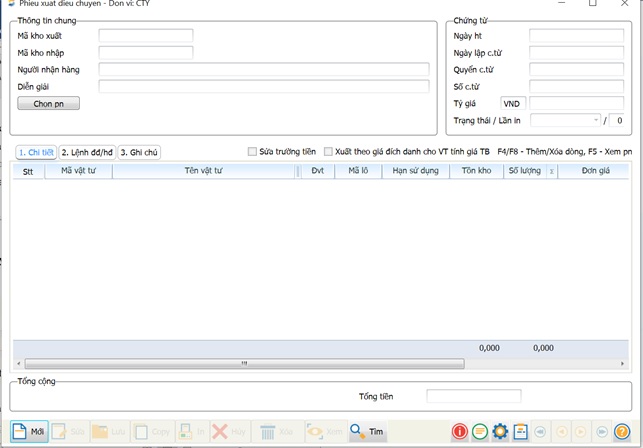 - Trong trường hợp điều chuyển kho 1 bước thì phiếu xuất điều chuyển được cập nhật ở menu này, khi đó chương trình tự động tạo luôn phiếu nhập kho điều chuyển. Nếu thực hiện điều chuyển kho qua 2 bước thì phiếu xuất điều chuyển cập nhật ở menu phiếu xuất kho (chọn mã hạch toán 5)