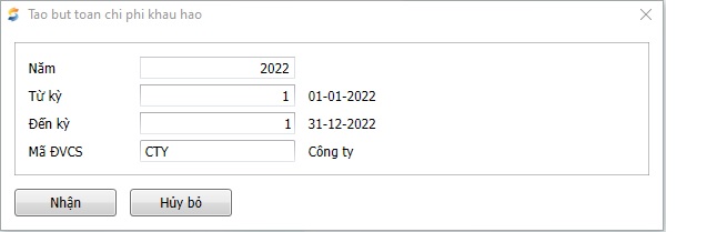 1. Chọn kỳ cần tạo bút toán chi phí khấu hao, sau đó nhấn “Nhận”