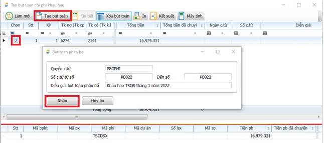 3. Nhấn <<Nhận>> để thực hiện bút toán phân bổ.