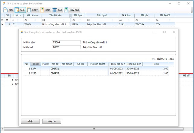 Chức năng: Khi cần có thể phân bổ khấu hao tài sản theo nhiều tài khoản chi phí, nhiều bộ phận sử dụng, theo nhiều vụ việc,…và phải khai báo hệ số phân bổ khấu hao cho từng tài khoản, bộ phận, vụ việc … tương ứng.