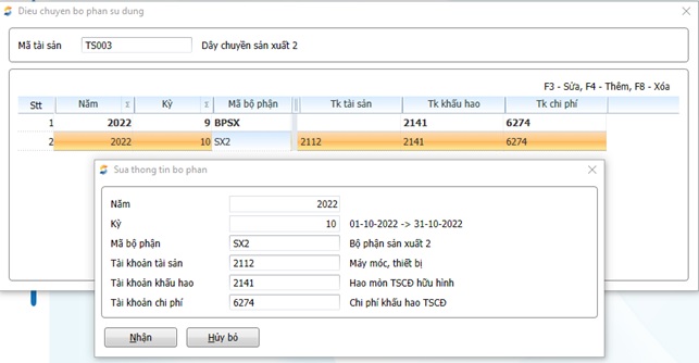 2. Nhấn F4 để thêm khai báo thông tin các tài khoản ở bộ phận được điều chuyển đến