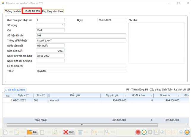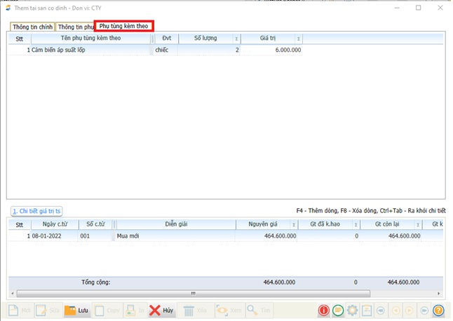 • Tên phụ tùng kèm theo: Nhập tên phụ tùng kèm theo khi mua tài sản