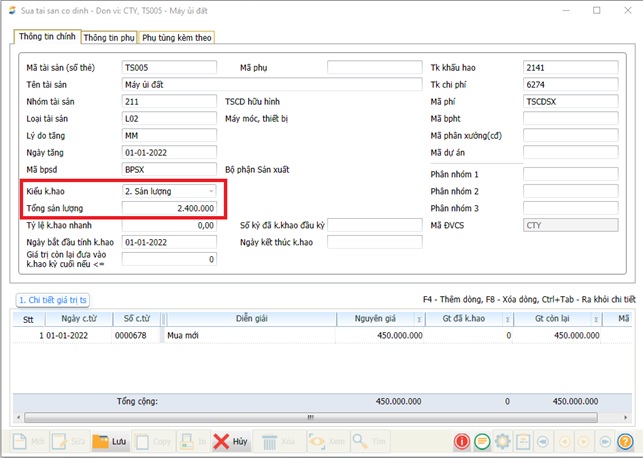 b. Nhập sản lượng theo công suất thiết kế của TSCĐ trong ô “Tổng sản lượng”