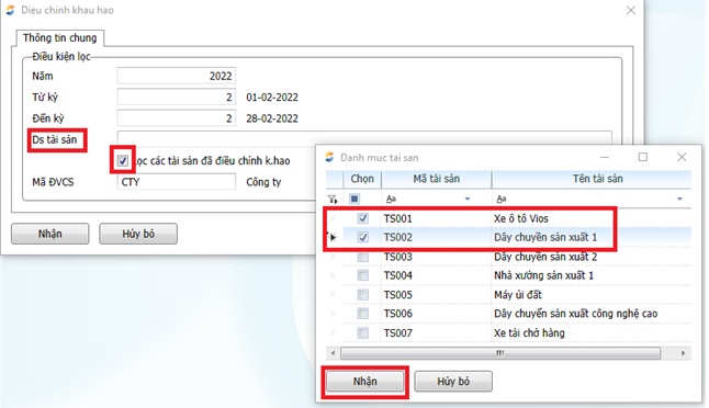 1. Chọn kỳ, tài sản, bộ phận sử dụng cần khai báo hệ số phân bổ sau đó nhấn “Nhận”