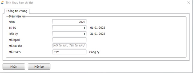 • Chọn kỳ tính khấu hao chi tiết, mã bpsd (Bộ phận sử dụng) nếu muốn tính riêng cho 1 bộ phận, mã tài sản (nếu muốn tính riêng cho 1 tài sản nào đó) hoặc để trống để tính cho toàn bộ tài sản